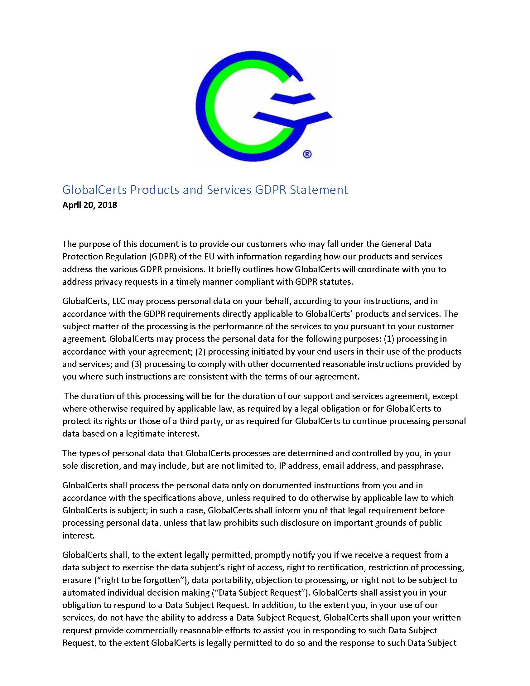 GlobalCerts Products and Services GDPR Statement